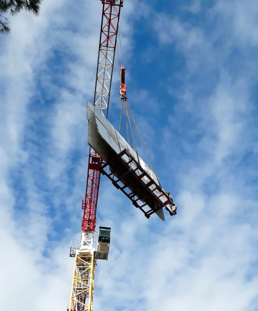 Une fois arrivées sur site, les tranches de marbre ont été déchargées par la grue du chantier, afin de permettre leur prise en charge immédiate et leur acheminement par les airs vers la zone d’installation.